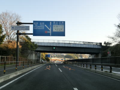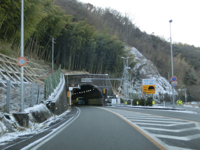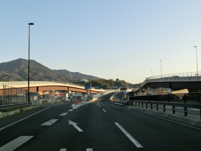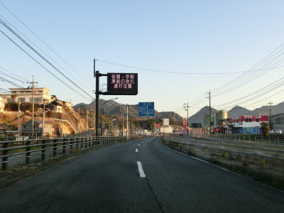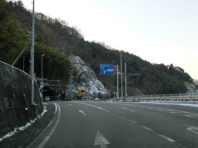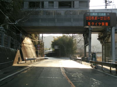 | 左にカーブしながら山口r112交差点を通過した直後に岩国トンネルに入る。この交差点までが異常気象時通行規制区間である。トンネルを出ると緩やかに下り、旧道と思われる市道との錦帯橋入口交差点を通過する。交差点の名称が示す通り、右折して市道を進めば錦帯橋に行く事ができる。 | ||