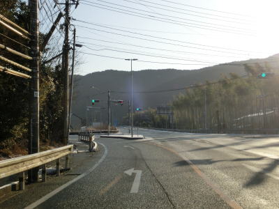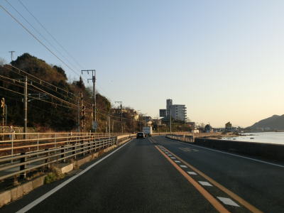 | 永慶寺大橋を渡った先で緩やかな左カーブを曲がり、JR山陽本線と海の間を走る。市道との早時交差点では左折専用車線が設けられており、交差点を過ぎると片側2車線となるが、200mも走らないうちに右側の車線に合流してしまうため、片側2車線道路と言える状況ではない。 | ||