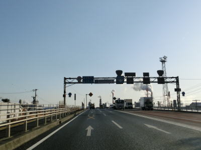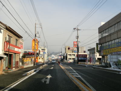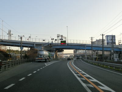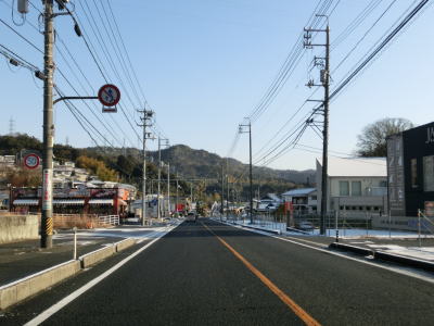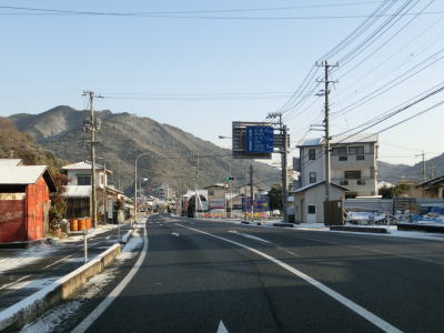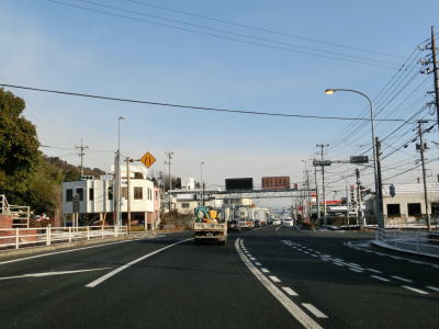 | 立石交差点から約1.8km走ると岩国港交差点を通過し、その直後に左側車線がなくなる。車線減少を示す斜めの矢印は400mも手前から描かれている。対面2車線道路になっても交通量は多いままで流れの良くない状態になる。三菱化学の岩国大竹工場の西側を走っていると和木町に入る。 | ||