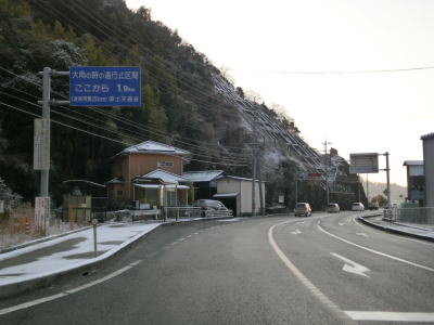 | 山陽道からの右カーブを曲がっていると山口r1との交差点を通過する。r1は路線名を岩国大竹線と言って県境を跨いだ県道で、関関バイパスと呼ばれており県境は関々トンネルで貫かれている。ただし、大竹市側に狭路区間が存在している。 r1交差点からは異常気象時通行規制区間に入るが、規制値は連続雨量250mmと酷道区間に比べると高い数値である。錦川の左岸を走っていると岩国市街地の西端と言える集落を通過するが、この集落も異常気象時通行規制区間の中である。 |