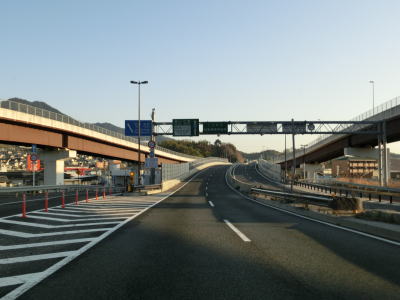 | 屋代トンネルからは緩やかな勾配を下って行く。片側2車線で信号機もなく、さらに案内標識が緑色だが、有料道路ではなく無料で通行できる。過去に有料道路であった時期もない。広島r41波出石交差点や広島r290交差点などに向かう五日市ランプの側道が分岐すると大きく右にカーブして進行方角を北東から東へと変える。広島市街方面とのみ接続している皆賀ランプの側道が合流した直後に広島市西区に入る。 | ||