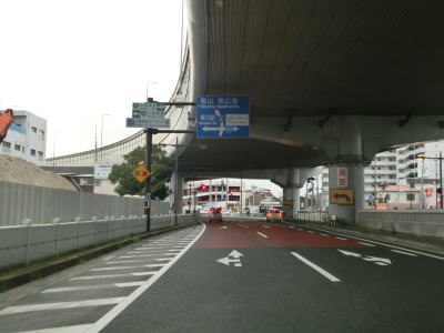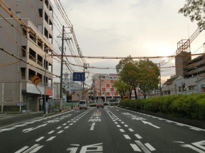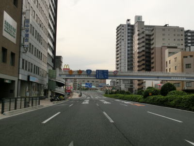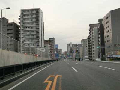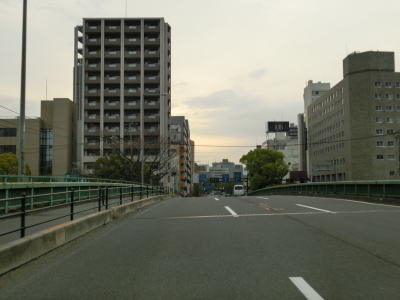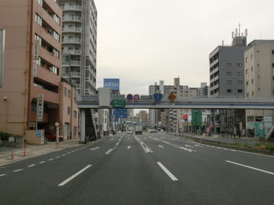 | 平野橋東交差点からはまた片側4車線道路となるが、約600m先の出汐町交差点で左端車線が左折専用車線となり、交差点を過ぎると片側3車線道路になる。その後は交通量の多い片側3車線道路を走るが、左と右のカーブが1ヶ所ずつある。 | ||