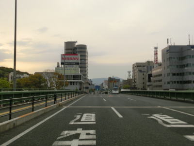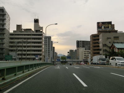 | 高架道路の下を走っているとは右の急カーブを曲がり、天満川に架かる新観音橋を渡って広島市中区に入る。橋の手前で高架道路が現道の上を横切っており、新観音橋東詰交差点でバイパスの観音ランプが合流する。庚午ランプ〜観音ランプのバイパスは他の道路と接続していない高架道路のため比較的スムースに走る事ができるが、観音ランプが接続している新観音橋東詰交差点を先頭とした渋滞が発生しやすく、通行する時間によっては最後まで快適に走れるとは言い難い。なお、ここより東の区間にもバイパスが計画されているようだが、現時点では工事すら始まっていない。 | ||