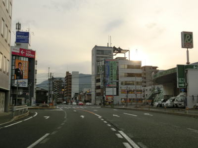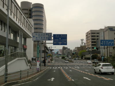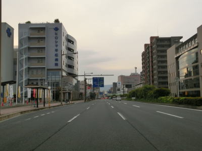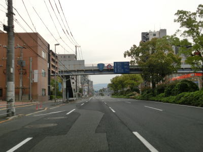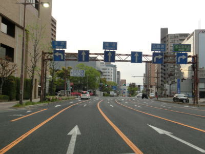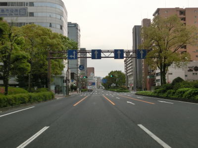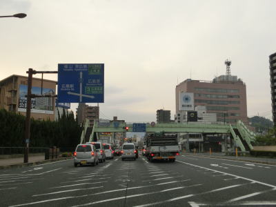| 広島市役所前交差点を過ぎると片側4車線(西向きは3車線)道路になるが、約350m東の国泰寺交差点で左端車線が左折専用車線になってしまう。以降は上下線とも片側3車線の道路を走る。写真では交通量が少ないように見えるが、これは早朝のためであり昼間であれば非常に多くの車が走っており常に流れが悪い。 | ||