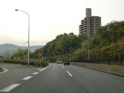 | 庚午ランプの側道に進むと7%とやや急な勾配を下る。下には山陽新幹線と広島電鉄が通っているが、特に目印がある訳ではない。2車線分の幅のある側道を下り切った直後に西広島バイパス入口交差点を通過する。案内標識には表記されていないが、右折の商工センター方面がR2の現道である。 | ||