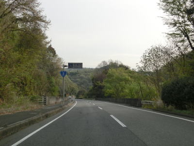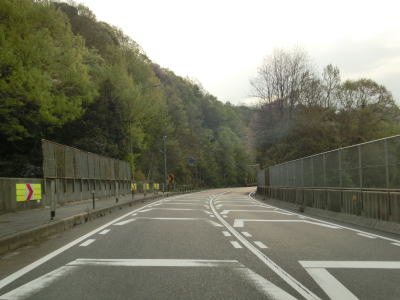 | 竹原市に入ってからも上り勾配が続いており、新田万里トンネルから下り勾配に転ずる。東向き車線には田万里隧道があり、この事からも西向き車線が供用されたのちに東向きのバイパスを造って片側2車線化したものと推測できる。 新田万里トンネルを出てすぐに上田万里橋を通るが、その下には田万里川だけでなく西向き車線もある。新田万里橋を渡り終えてすぐに側道のような道路が分岐する。これより先の本線は自動車専用道路であり、歩行者や自転車は側道を通らなければならない。125cc以下の車両は特に禁止されてないので本線を走れるのだろう。 |
