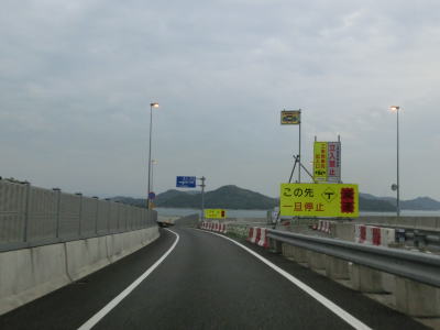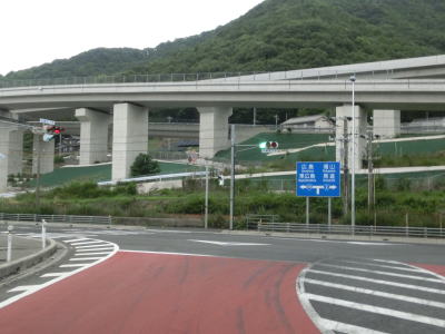 | 三原バイパスの東に接続する木原バイパスが供用されていないため、強制的に糸崎ランプで高架道路から降りる事になる。8%の急勾配を下り、供用されているかに見える木原バイパスの本線の高架道路の横を約300m走ると市道とのT字路に突き当たる。そのT字路を一旦停止した後に右折して福山・尾道方面に進む。 | ||