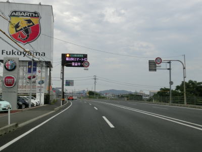 | スマートICを併設している福山SAの出入口に当たる市道との津之郷橋東詰交差点を通過する。福山西ICと福山東ICのほぼ中間に位置する福山SAのスマートICは車種と時間に制限があり、普通車(全長6m以下)、軽自動車、2輪車が6〜22時の間に利用できる。山陽新幹線、JR山陽本線と瀬戸川の間を走っていると中央分離帯が現れて片側2車線道路になる。 | ||