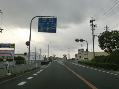 | 沿線に商業施設が多く建っている状態の中を淡々と走る。昼間であれば交通量の多い区間だが、早朝や深夜はそれほどでもない。東加古川駅の近くで兵庫r383加古川町新在家交差点を通過し、さらに2車線道路を走っていると兵庫r381・r382高畑交差点を通過する。高畑交差点の少し手前には山陽道の旧道が分岐している。 | ||