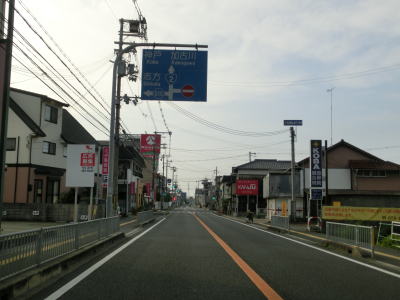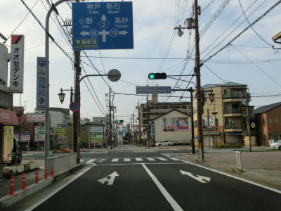 | 加古川駅前東交差点からも2車線の一方通行道路が続いている。加古川橋東詰交差点から約1.4km走ると市道との平野西交差点に至るが、この交差点で一方通行区間が終わる。右側車線が右折専用車線となっているが、その右折する道路が西向き方向の道路である。 | ||