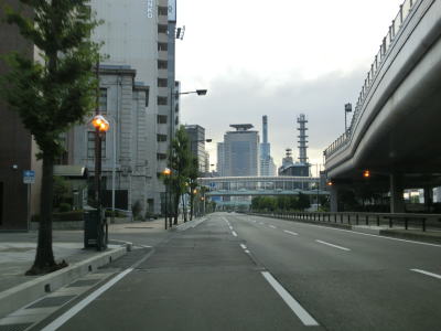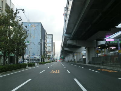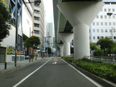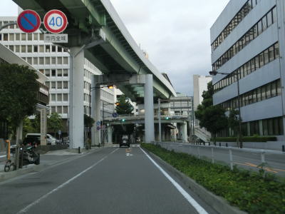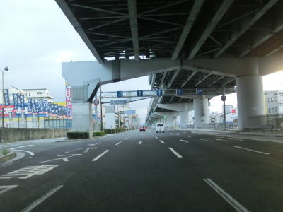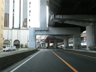 | 弁天町交差点を過ぎると片側3車線になるが、すぐに右端車線がなくなってしまう。その後また片側3車線道路となり緩やかな右カーブを曲がっていると中突堤筋交差点を通過する。この交差点は右折できないが、一旦左折してロータリーのような場所を回り込む事で結果として右方向に進む事ができる。阪神高速3号神戸線が南方向に逸れると上空を覆う高架道路はなくなるが、片側3車線という道路状況に変化はない。 | ||