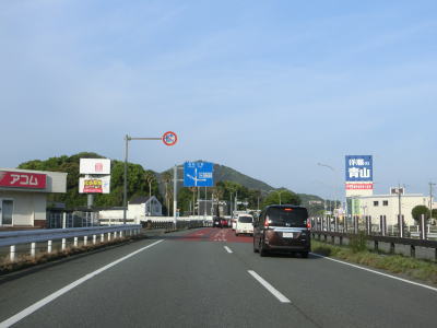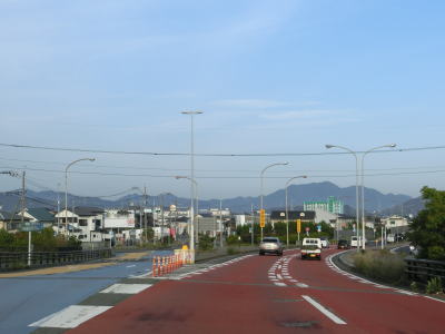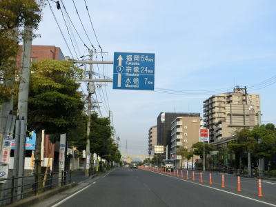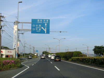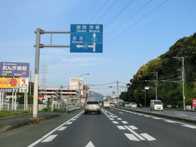 | 下り勾配が終わる手前で石丸跨道橋で福岡r29の上を通って福岡r463冨地原交差点を通過する。平坦な片側2車線道路を少し走ると福岡r75徳重交差点を通過する。宗像市の中心部からはやや慣れているものの幹線国道のため交通量は多い。 | ||