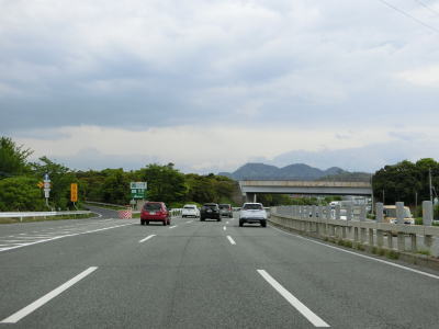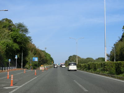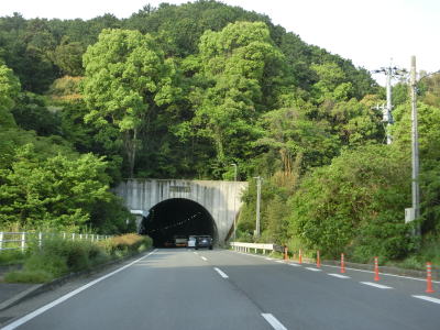 | 野間ランプ付近からは山間部を通っており沿線の家屋も途切れる。岡垣トンネル、次いで城山トンネルをくぐり、右カーブの途中で宗像市に入る。市町境付近で合流してくる側道は旧道であろう。 | ||