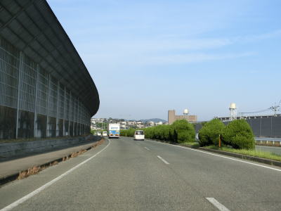| 福岡r285との今古賀ランプを通過する。遠賀町役場はR3の旧道の福岡r299とr285の交差点の北東にあり、現在のR3では今古賀ランプが最寄りのランプである。今古賀交差点の上を越えて戸切高架橋を通り終えると盛土となり遮音壁が途切れる。 | ||