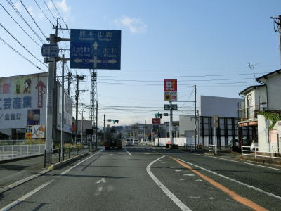 | 熊本市の北区役所の出入口に当たる熊本r30北区役所前交差点は右側の車線から右前方へと進む。植木市街方面のr30が旧道と思われるが、そちらに進む車両も少なくない。R3の進行方向をはっきりさせるため案内標識と路面は赤く区分けされている。 北区役所前交差点からは交通量の多い対面2車線道路を下り、約800m先でR208舞尾交差点を通過する。案内標識等に表記されていないが、ここから南はR208が重複している。また、左折の大津方向はr30となっているが、厳密に言えば交差点から約200mの区間は県道ではなく市道である。 |