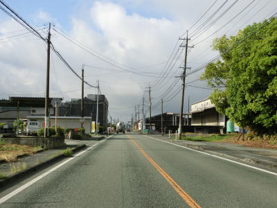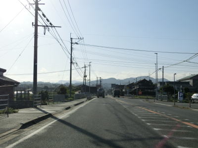 | 山鹿大橋を渡ると市街地が終わる。北詰で熊本r330と交差しているが、これは熊本山鹿自転車道線であり、平面で交差している道路ではなくその北のカルバートボックス内をくぐっているのが県道である。沿線の家屋が疎らに建っている中を走っていると熊本r55南島交差点を通過する。 南島交差点以降は沿線の家屋がさらに少なくなり田畑の方が多くなる。道路状況はほぼ平坦かつ直線基調のため見通しが良く非常に走りやすい。旧鹿央町に入った後に熊本r119持松交差点を通過する。 |