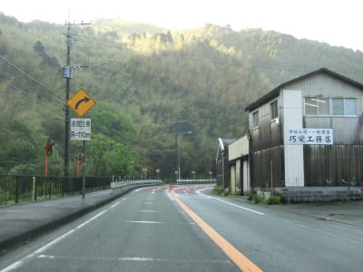| 吹春交差点以南も辺春川沿いの対面2車線道路という点に変化はないが急なカーブが多くなる。屈曲ありの警戒標識に曲線半径を記した補助標識が取り付けられている。数値は100〜120mとそれなりに急なカーブである。丸山橋を渡ってからは急カーブは少なくなり中辺春集落を通り抜ける。 | ||