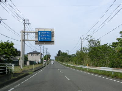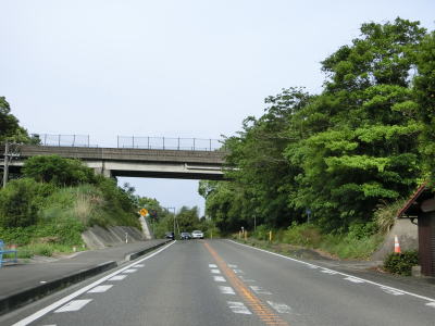 | 鹿児島県に入ってからも道路状況と風景に大きな変化は見られない。海岸線に近い場所を通っているものの海が見える場所は殆どない。反対の山側に視線を向けるとコンクリートで固められた山が視認できる。R3/E3A南九州道の建設に伴うものであろう。北薩オレンジロードという広域農道との前田交差点を通過して緩やかな右カーブを曲がると前田跨道橋をくぐる。 | ||