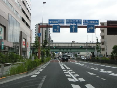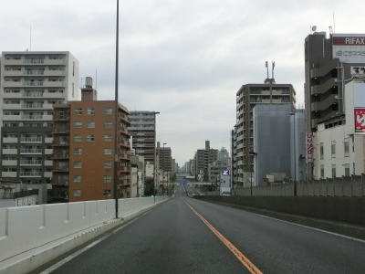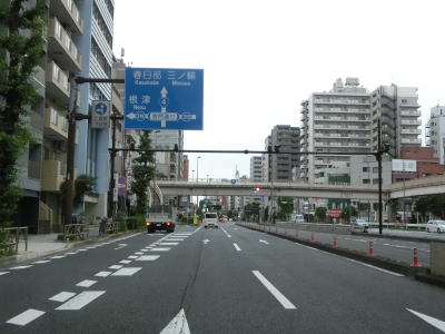 | 右カーブを曲がって短い勾配を上ると千住大橋で隅田川を渡って足立区に入る。橋の勾配を下り切ると足立市場前交差点を通過して京成本線の下をくぐる。その後右にカーブして東京r461千住宮元町交差点を通過する。 | ||
