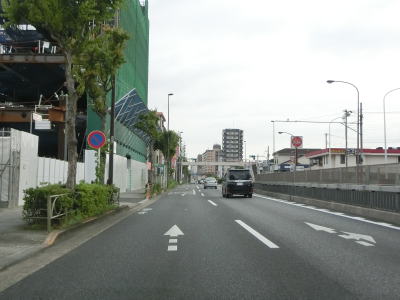 | 足立区役所の東を通過した後に東京r318との交差点を通過する。r318は環七通と呼ばれる幹線道路で、一桁国道の上を梅島陸橋で越えている。r318交差点からも片側2車線道路が続いており、反対側車線が高架橋になると同時に左カーブを曲がって東京r49交差点を通過する。手前の西保木間交差点と奥の毛長川橋前交差点には信号機が設置されているが、その間のr49交差点には設置されていない。なお、r49はR4の旧道に当たる。 | ||