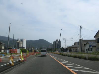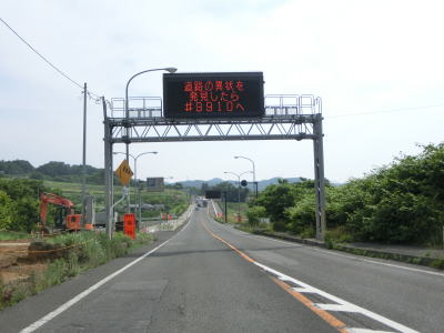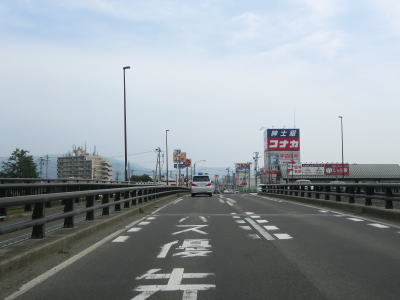 | 徐々に沿線の商業施設が少なくなっていくが交通量は多いままである。福島r155瀬上町裏交差点を通過して少し走ると瀬上橋を渡る。その後程なくして市境を越えて伊達市に入る。電光掲示板にR399の伊達橋が通行止という情報が表示されていたが、これは走行日の3ヶ月ほど前の2022年3月16日の地震で被災したためである。ジョイントがずれたという事で復旧には年単位の時間を要する模様である。 | ||