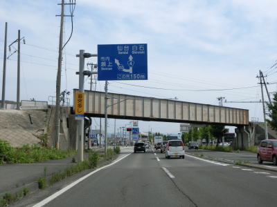 | 対面2車線道路に戻ってからも勾配を上っていると貝田駅の傍を通過する。駅の向こう側にはE4東北道の国見SAがある。貝田駅を過ぎたすぐ先で県境を越えて宮城県白石市に入る。勾配が上りから下りになるのはE4東北道の越河橋の手前からである。 | ||