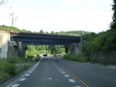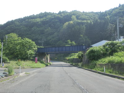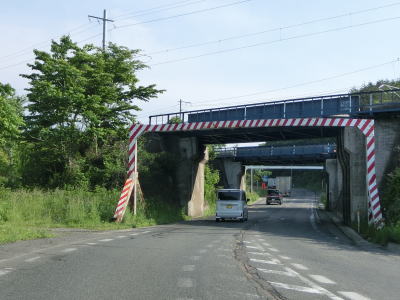 | 北上川といわて銀河鉄道の間を走っていると大きく左にカーブした先で右の急カーブを曲がっていわて銀河鉄道の跨道橋をくぐる。2つの跨道橋が隣接しているが、どちらもいわて銀河鉄道である。 | ||