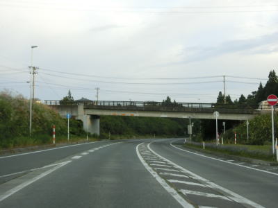 | さんのへフルーツロードという広域農道の玉ノ木橋をくぐり、緩やかな勾配を下っていると市道との交差点を通過する。この市道は青森r258に接続しており三戸町の中心部を通り抜けるルートの一部である事からR4の旧道であろう。 旧道との交差点を過ぎてすぐに三戸橋で熊原川を渡り、その先でR104・r258とのランプを通過する。案内標識に表記されていないが、ここから十和田方面はR104が重複している。 |