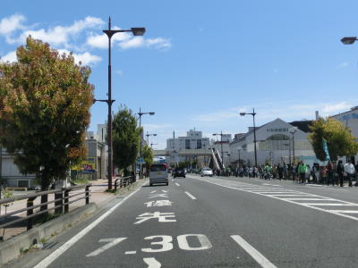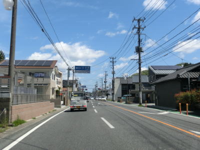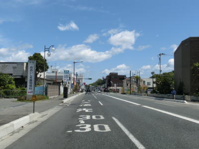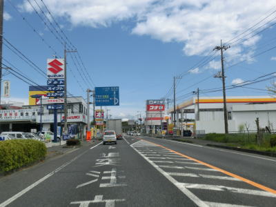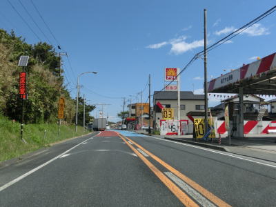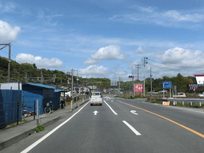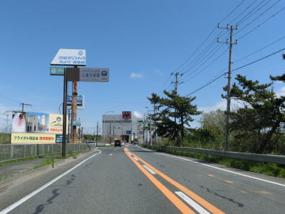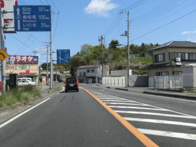 | 4車線道路を走っていると新川に架かっている尼子橋を渡った直後の北詰で市道との内郷御台境交差点を道なりに右にカーブして通過する。その後はいわき市の市街地を通っているため非常に交通量が多くなる。タイミング悪くメーデーのデモが行われており信号がデモ優先で制御されていたため、交通量の割に長い渋滞に巻き込まれてしまった。その渋滞の先頭はR399十五町目交差点であった。R399は2016年4月時点で葛尾村〜浪江町と浪江町〜飯舘村の2ヶ所で原発事故に伴う通行止規制が敷かれている。 | ||