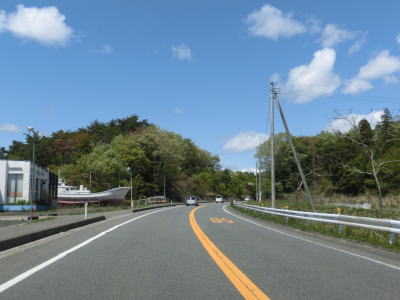 | R114・R459・福島r254知命寺交差点を過ぎてすぐに請戸川橋を渡り、浪江町の市街地から離れていく。橋を渡り終えてからは緩やかな勾配を上る。その途中でナミエボウル(廃業?)の前を通過するが、建物の北側には船が置かれている。場所を考えると津波で流されたとは考えにくいので、東日本大震災以前からモニュメントとして置かれていたと考えるのが自然だろう。そのナミエボウルから程なくして名もなき峠を越えて南相馬市に入る。 | ||