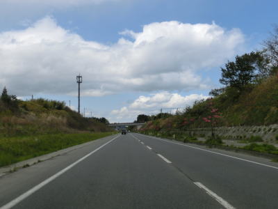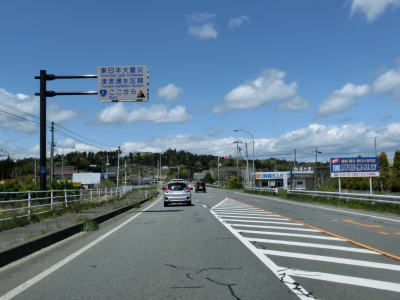 | 南相馬市に入っると反対側の南向き車線に約600m程の登坂車線が現れる。登坂車線がなくなってからも下り続けるが、勾配は非常に緩やかである。その勾配を下り切った所で東日本大震災において津波で浸水した区間の始まりを示す標識が立てられている。その標識を過ぎると津波に浸かった区域に入るのだが、5年も経過しているとさすがにその痕跡は見当たらなかった。 | ||