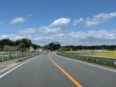| 下高平交差点を通過して少し走ると仙台市といわき市の中間地点を示す標識を通り過ぎる。仙台市といわき市のどの地点を指すのかは不明だが(市役所?)、どちらも76kmの距離にある。その後も2車線快走路を走っていると緩やかな勾配を上った後に緩やかに下るが、そこで再び津波震災区間に入る。福島r265柚原交差点を通過してから真野川を渡ると津波浸水区間が終わるが、特に標高が上がる訳でもない。 | ||