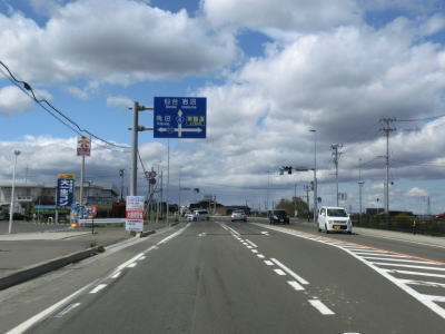 | 宮城r54交差点を過ぎると側道が現れて片側3車線+側道1車線となる。側道は大きな交差点のたびに本線や交差する道路に合流するので単に通過するだけの場合は実用性は低い。陸上自衛隊の霞目飛行場の西を通過しする。東日本大震災では仙台空港は津波の被害を受けたが、霞目飛行場は少し内陸にあったため被害を免れて救助活動の拠点として使われていた。仙台東部道路の仙台東ICと繋がっている宮城r23と仙台市の市街地に至る宮城r137との六丁目交差点を通過するが、r23への右折車線は3本も設けられている。 | ||