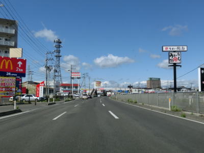 | 阿武隈橋を渡り終えた直後に車線が増えて北向き2車線+南向き1車線の変則3車線道路になる。そのまま緩やかな勾配を下った所でR4藤波交差点に突き当たる。R6には数少ない上位国道との交差点だが、この藤波交差点はR6の終点ではなく右折してR4に重複して仙台方面に進む。ただし、この先は全てR4と重複しているため表にR6が出てくる事はなく、藤波交差点が実質的な終点と言える。 藤波交差点からは片側2車線となり、非常に交通量の多い状態を走る。JR東北本線・常磐線の岩沼駅からは少し離れた場所だが、岩沼市役所に近く沿線には商業施設が多い。流れの悪い片側2車線道路を北上していると名取市に入り、直後に宮城r25交差点を通過する。東北本線に近い位置を並走していると宮城r258の館腰跨線橋の下で宮城r20交差点を通過する。r258は跨線橋のため左折する事ができず、約400m北にある館腰駅前の交差点を右折する事で跨線橋に進む事ができる。r20の路線名は仙台空港線と言い、その名の通り仙台空港のターミナルとR6(実質R4)を結んでいる県道である。 |
