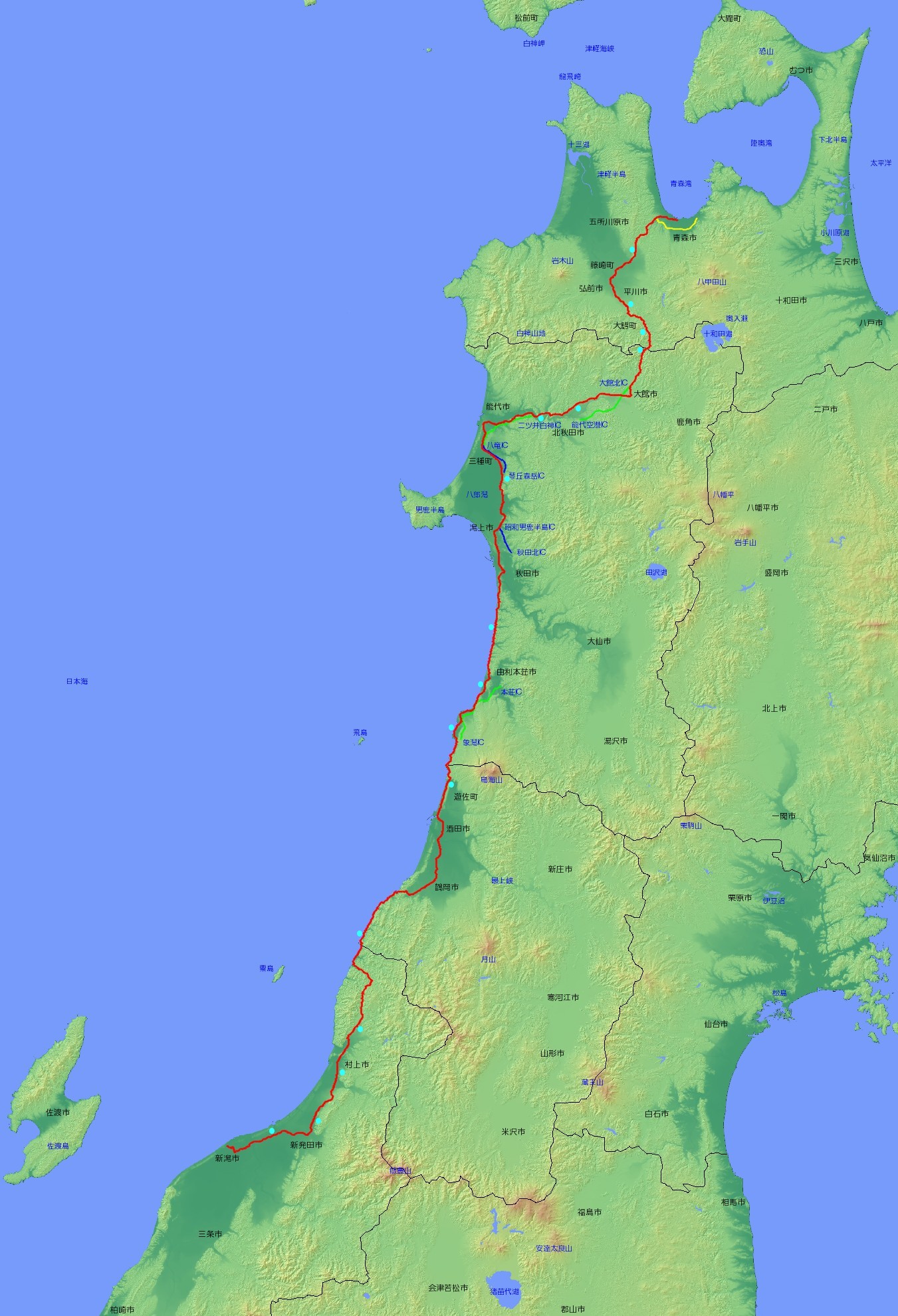 | 主な経由地 | 新潟市〜新発田市〜村上市〜 〜鶴岡市〜酒田市〜遊佐町〜 〜由利本荘市〜秋田市〜潟上市〜三種町〜能代市〜北秋田市〜大館市〜 〜平川市〜大鰐町〜弘前市〜藤崎町〜青森市 |
