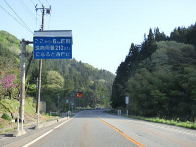 | 葡萄集落を過ぎると6kmに渡る異常気象時通行規制区間に入る。連続雨量が210mmを超えると通行止になる。大型貨物車両の交通量が少なくない区間だが、閉鎖ゲートの前に転回できる駐車帯等は設置されていない。 異常気象時通行規制区間に入って少し走ると新潟r6交差点を通過する。左折してr6を走ると日本海沿いのR345に行く事ができる。朝日橋で葡萄川を渡って蛇ノ沢3号洞門、蛇ノ沢2号洞門、蛇ノ沢1号洞門をくぐる。洞門は2つしか確認できない事から、3号と2号もしくは2号と1号が延伸で繋がったと思われる。 |