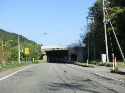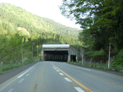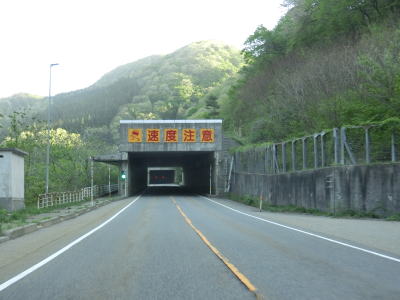 | 蛇ノ沢1号洞門を出てすぐに朝日トンネルに入る。トンネルから下り勾配となり、出口には長い下り坂かつカーブが多いため速度に注意する旨の警告看板が設置されている。とは言うものの勾配は1.5%なので特別急という訳ではない。大型貨物車両の通行が多い幹線国道としてはという事だろう。 | ||