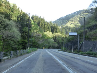 | 上り勾配の直線道路を走っていると建設中のE7日本海東北道が確認できる。勝木川の谷筋差し掛かるとカリカ坂洞門と中津原洞門を相次いでくぐる。洞門の間には公衆トイレのある簡易駐車場が設置されており、その向かい側には昔ながらの小さいドライブインがある。 | ||