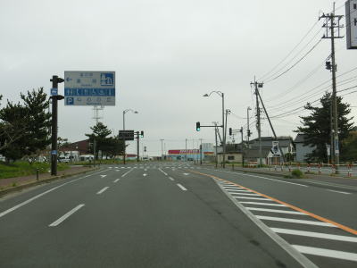 | 出戸集落付近で右カーブを曲がってR7も海岸線から離れて内陸へと進み、JR羽越本線と近接する茂秋田r43西目高校前交差点付近で再び離れて行く。西目高校前交差点からは平坦な直線道路を真北に向かって走る。 | ||