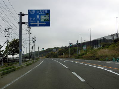 | 由利本荘市に入るとE7日本海東北道が東に逸れていく。JR羽越本線との並走は続いており、左、右とS字状にカーブして跨道橋の下をくぐり、程なくして線路も東に逸れて離れて行く。 | ||