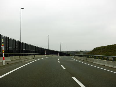 | 対面2車線道路に戻ってすぐに勝平はまなすトンネルと勝平シェッドをくぐる。勝平はまなすトンネルは片側2車線分で造られているが、勝平シェッドは2車線分しかない。右カーブを曲がりながら臨海大橋で旧雄物川(秋田運河)を渡る。 | ||