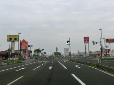 | 交通量の多い片側2車線の直線道路を走っていると新潟r263堺西交差点を通過する。ウォッちずを含む多くの地図では左折の長岡駅方面はR351(のバイパス)とされているが、現地においてはr263となっている。現地の案内標識では堺西交差点から左岸バイパスとの交差点までの約400mは県道で、それ以西がR351となっている。 堺西交差点から約700m走ると左側に側道が分岐するが、その先にはR404との喜多町交差点がある。この区間のR404は市街地を通る狭い2車線道路のせいか、案内標識におにぎりが表記されていない。 |