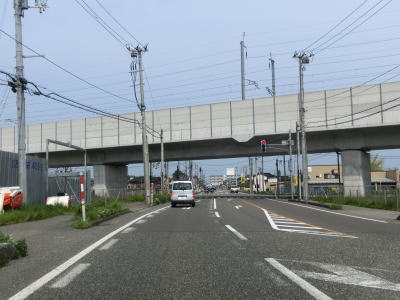 | R148横町交差点を通過してすぐに右側車線が減少し、左カーブを曲がった先で新潟r487寺島交差点を通過する。さらに進むと北陸新幹線の高架下をくぐり、右にカーブして北陸新幹線とえちごトキめき鉄道の間を走る。 | ||