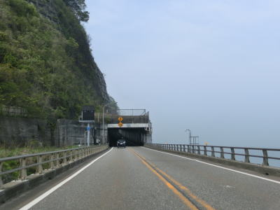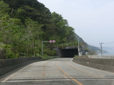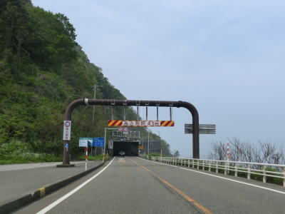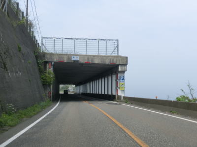 | 親不知観光ホテルの前を通過した直後に天険トンネルに入り、以降は約2kmに渡って浄土、先ヶ鼻、赤崎、三段滝という洞門を連続で通過する。どの洞門も2車線ではあるものの小刻みなカーブが多く、大型トラックは車線をはみ出さざるを得ないカーブもある。不必要にショートカットしてセンターラインを割ってくる対向の乗用車も存在するのでトラック以外が対向車でも油断できない。三段滝洞門を出て左にカーブすると市振集落を見下ろしながら勾配を下る。 | ||