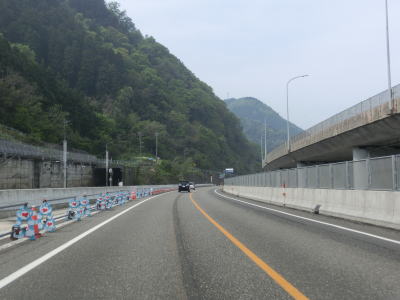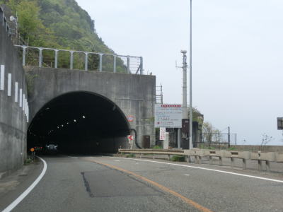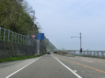 | 跨線橋からはえちごトキめき鉄道と近接して並走しながら10軒程度の家屋の前を通過する。緩やかな上り勾配を走っていると勝山洞門をくぐる。北陸道も北陸新幹線も通っている場所だがどちらも長大トンネルで通り抜けており、えちごトキめき鉄道にもトンネルが多い。R8もまず勝山洞門をくぐり、カーブの多い5%の上り勾配を走っていると長大なロックシェッドをくぐって子不知高架橋を渡る。高架橋の左側の山肌には旧道が確認できる。 | ||