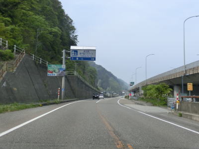 | 境川という分かりやすい名称の川を渡ると富山県朝日町に入る。境橋の西詰で富山r115交差点を通過し、そのすぐ先では富山r374交差点を通過する。r374交差点からは上り勾配となり登坂車線が設置されている。峠部分を過ぎると下り勾配となり、反対側の東向き車線に登坂車線が設置されている。この整備具合からも分かるが、境集落を迂回するバイパスであり、旧道がr374と思われる。 | ||
