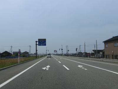 | 犬山交差点からは低いながらも盛土の上を走っており、さらに勾配を上ると布施川と片貝川を渡って魚津市に入る。魚津市に入ってすぐに平伝寺高架橋で富山r126の上を通過するが、西にある側道からr126との往来が両方向とも可能である。高架と盛土主体の2車線道路を走っていると経田跨線橋であいの風とやま鉄道を再びオーバーパスする。 | ||
