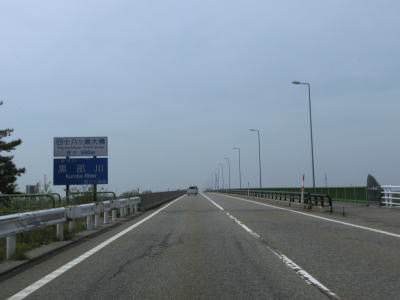 | 富山r110上飯野北交差点を過ぎると緩やかな勾配を上った後に黒部川を四十八ヶ瀬大橋で渡る。上流側にはさらに2車線分の橋脚があり、計画では片側2車線道路である事が窺える。黒部川は市町境のため橋上で黒部市に入る。 | ||