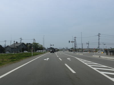 | 勾配を下り切った所で富山r374境交差点を通過する。その後はあいの風とやま鉄道と近接した状態を並走しており、越中宮崎駅の裏手を通過する。駅の出入口はR8の反対のr374側にある。富山r60交差点を通過すると緩やかな勾配を下る。 | ||