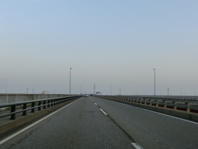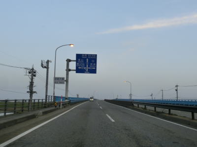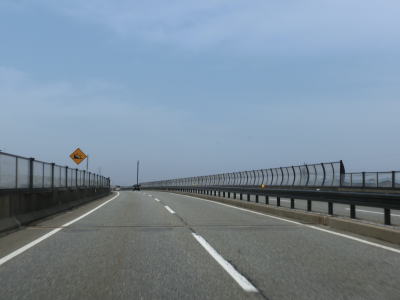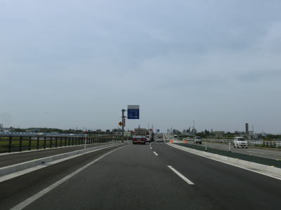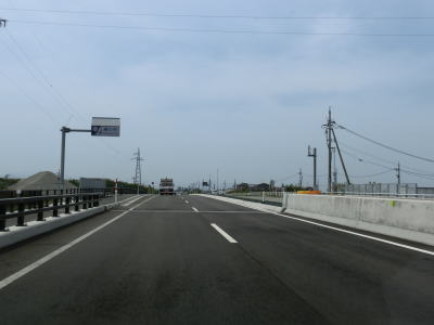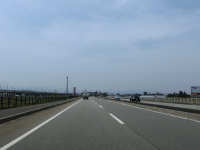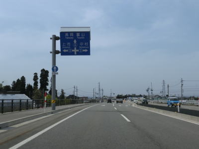 | 鏡宮交差点からの側道と合流し、片側2車線の富山高岡バイパスの東進が続く。富山r231沖塚原交差点を通過して少し進むと新しい舗装の跨道橋で富山r11坂東交差点を通過する。坂東交差点の跨道橋は2016年3月19日に供用が開始されており、通行時はまだ1ヶ月強しか経過していない。跨道橋からそのまま高新大橋で庄川を渡る。 | ||